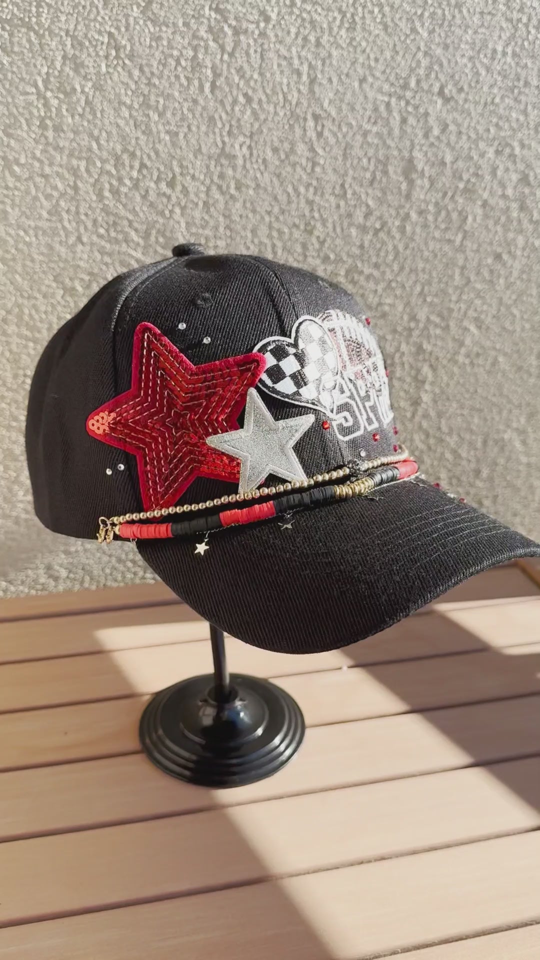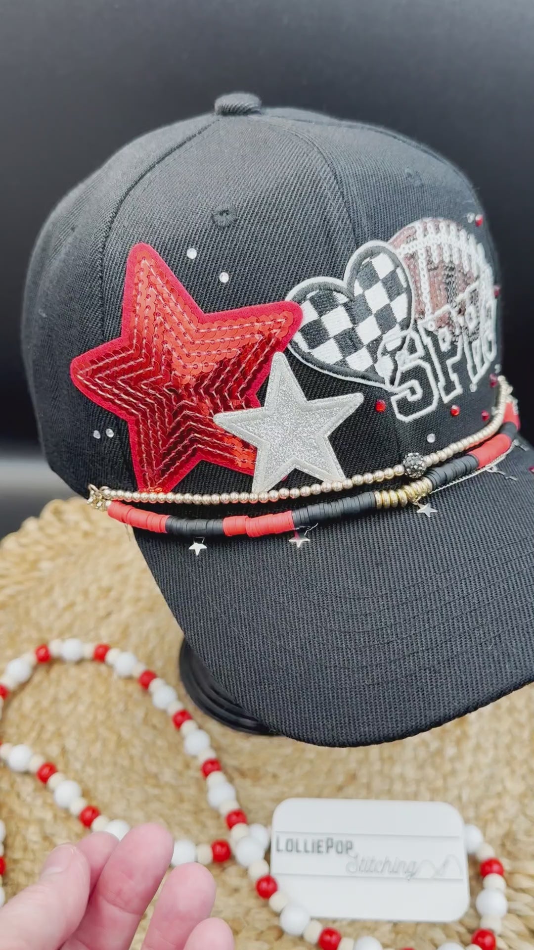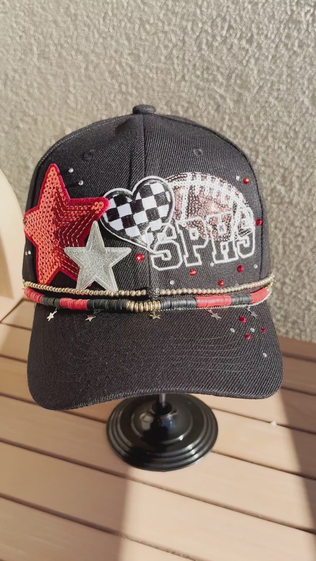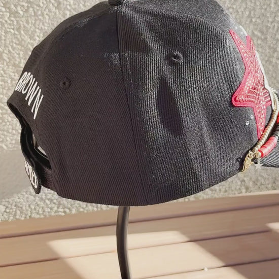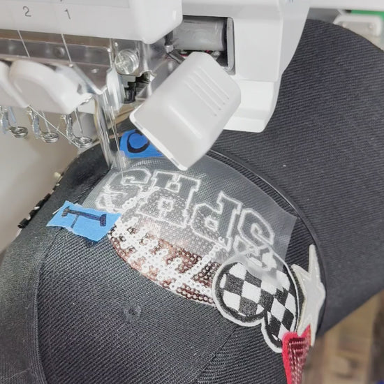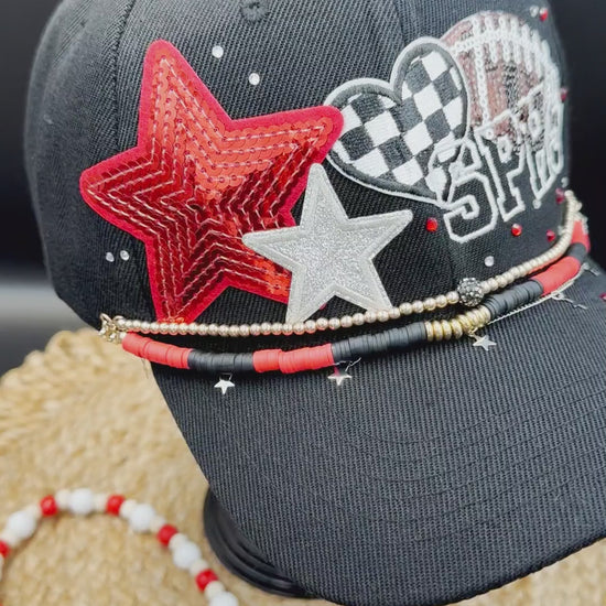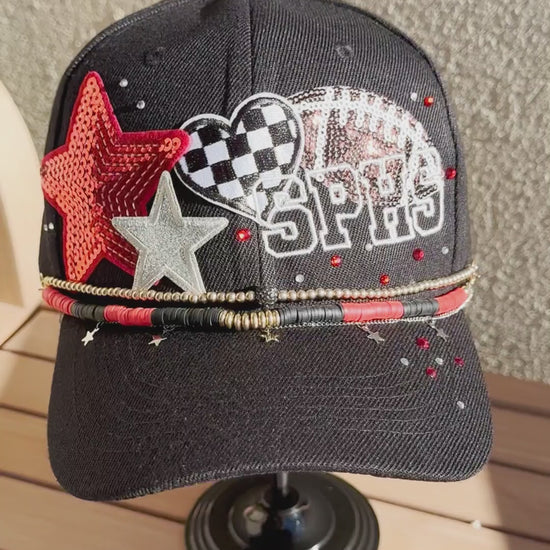 Celebrate your team with a custom-embroidered ball cap designed exactly how you envision it. Perfect for fans of professional, college, or high school team, this hat puts your team spirit & style on display. Choose your team's signature colors and add personalized embroidery - whether it's the team name, initials, or the mascot - enhanced with four decorative patches featuring embroidery, sequins, glitter with elegant satin stitching. Customize the front and back or both with text that represents your fandom. Finish your game day look with optional coordinating hat chains and/or bling to tie the whole look together.